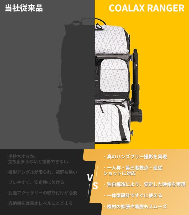 COALAX RANGERには、360°回転対応・最長1.5mまで伸縮可能な撮影アームを搭載しています。シーンに合わせて撮影角度を自在に調整でき、バックパック本体の映り込みも自然に避けられます。