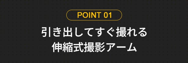 - ドローン不要。全長1.5mの撮影アームが両手を解放し、手軽に第三者視点の撮影を実現します。