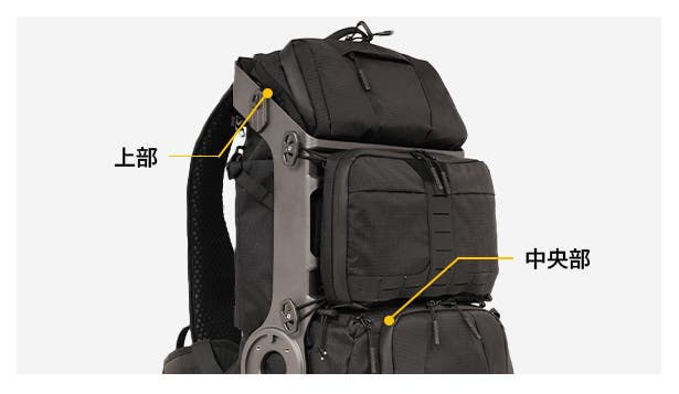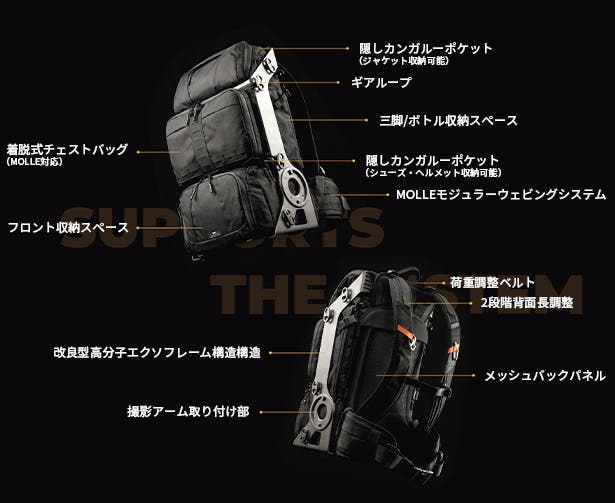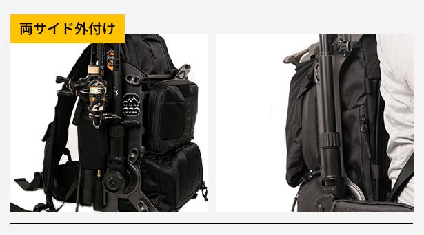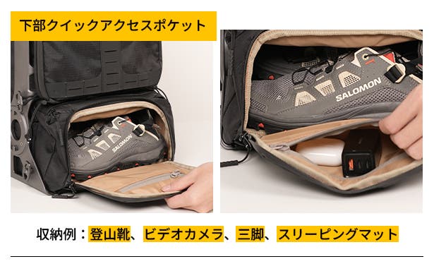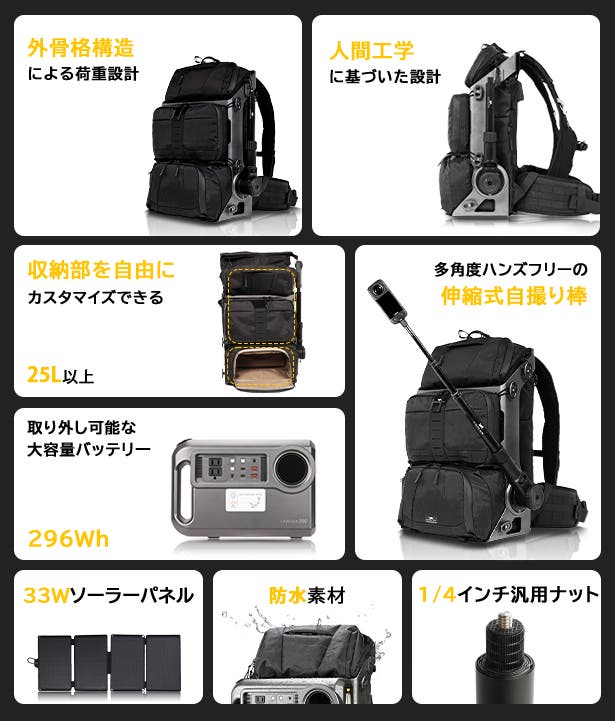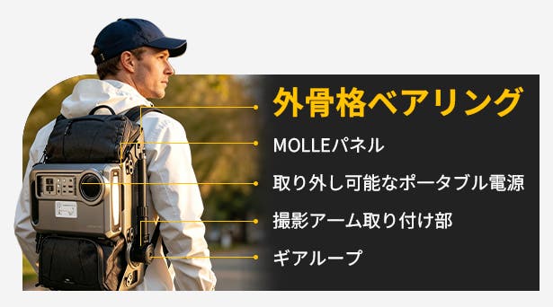 A:バックパックには外付けシステムを備えており、さまざまなアウトドア装備を拡張して取り付けることができます。さらに、RANGER電源ユニットの外付けにも対応しており、撮影機材への追加電力供給も可能です。