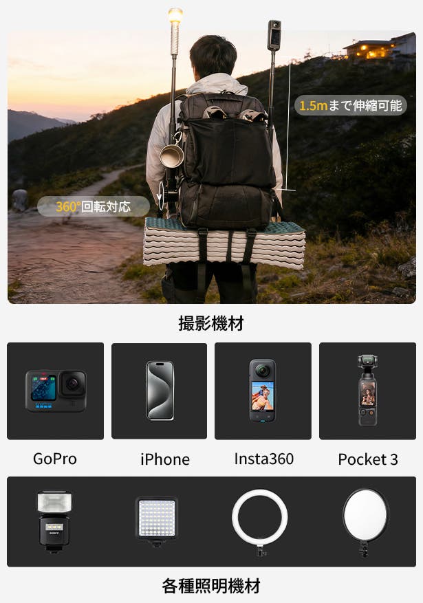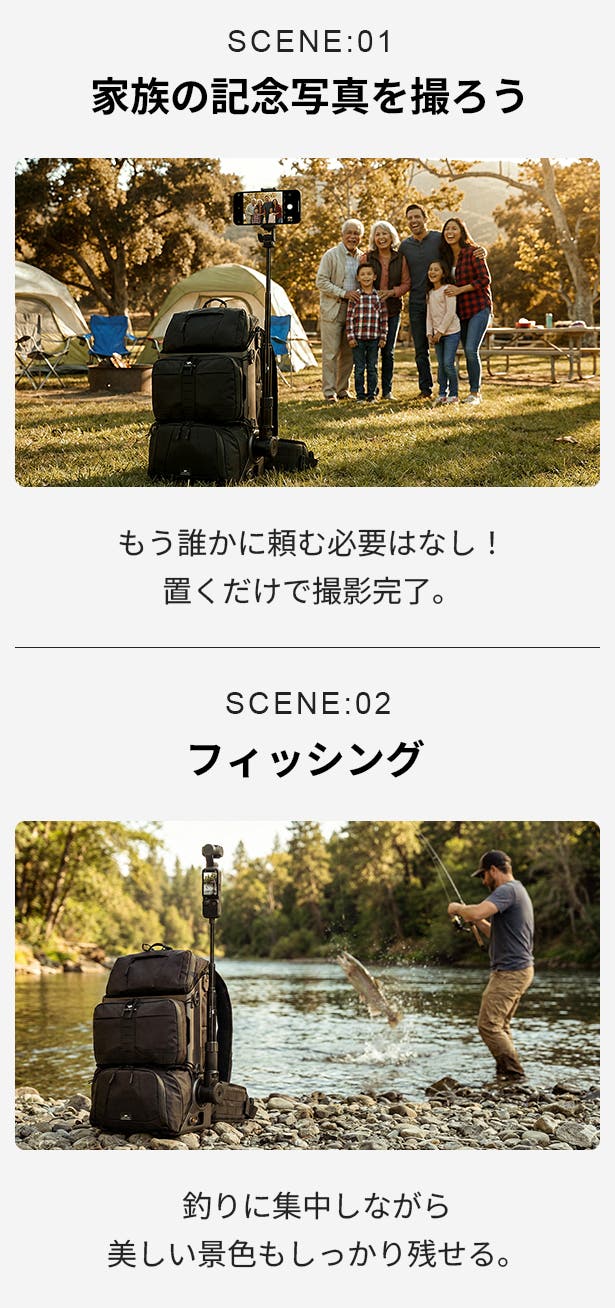 起伏のある登山道でも、凹凸のある川辺の岩場でも、バックパックを置いてアームを伸ばすだけで、ライブ配信やタイムラプス撮影をすぐに始められます。