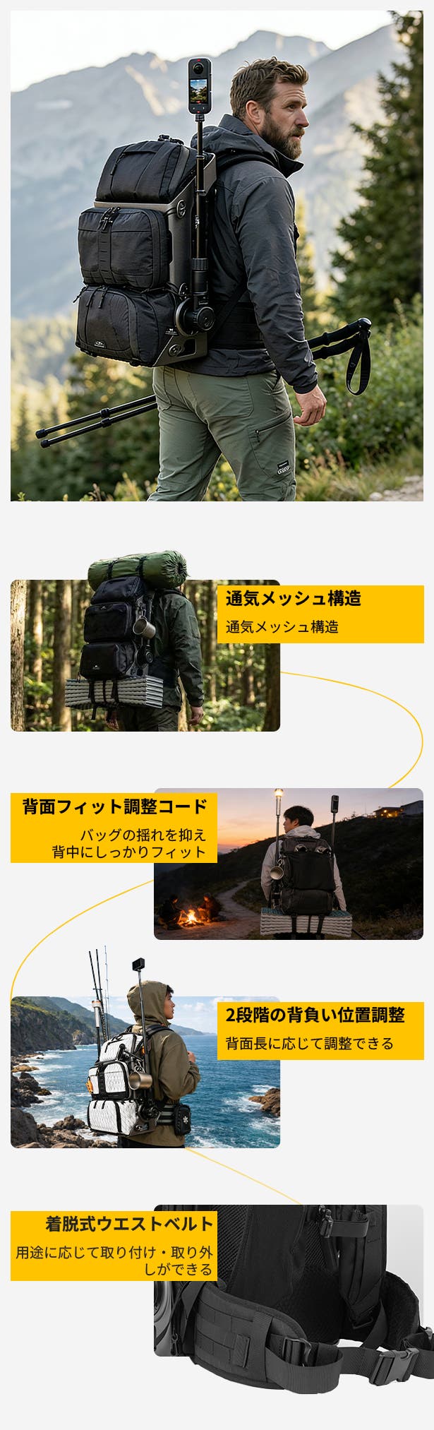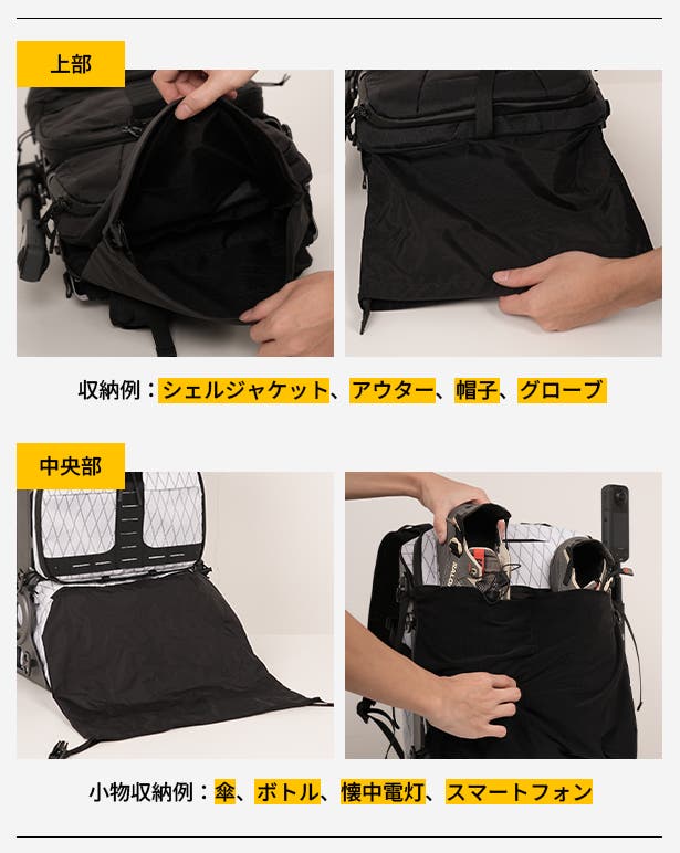- 隠しポケットと外付け拡張により、通勤から2泊3日のキャンプまで幅広いシーンで活躍します。