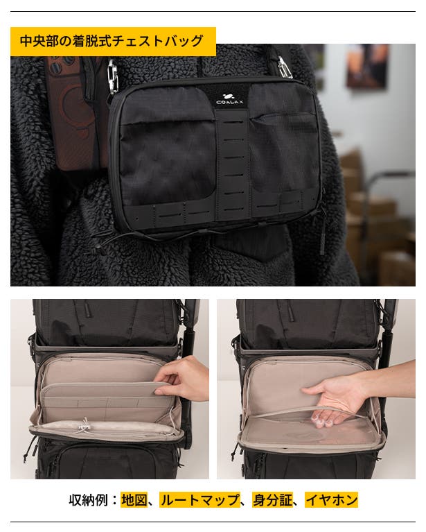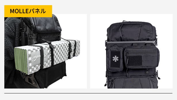 取り外し可能な設計で、仕切り付きのMOLLEシステムを採用しており、用途に応じた整理収納がしやすくなっています。
