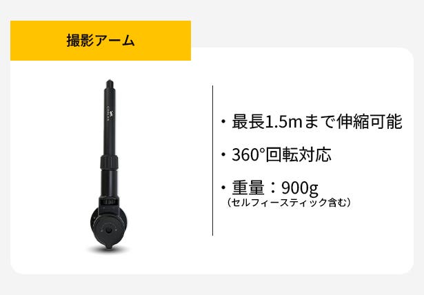 A:撮影アームは最長約1.5mまで伸縮可能で、360°の回転調整にも対応しています。撮影シーンに応じて自由に角度を調整でき、より多彩な画角で撮影できます。