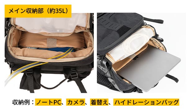 仕分けに便利な内部コンパートメントと、16インチまでのノートPCを収納できるスリーブを備えています。さらに、ハイドレーションチューブポートも搭載しており、アウトドアシーンでもスムーズに水分補給できます。