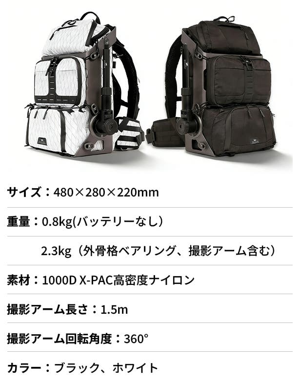 カメラを収納するだけのバックパックではありません。それは、持ち運べる撮影システムでもあります。バックパック背面から伸びる撮影アームによって、移動しながらでも、自然で安定感があり、奥行きのある映像を撮影できます。まるで、いつも背後にカメラマンがいるかのようです。