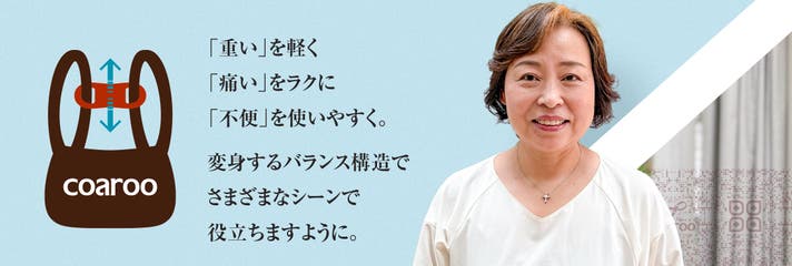 コアルーバッグはパッドを中心に左右の二重のベルトが広がることで、5通りの掛け方を可能にしました。本プロジェクトの中では新商品を通してその便利な掛け方をご紹介しますが、https://coaroo.co.jp/pages/about_coaroo こちらのページからは「コアルーバッグ」全体に共通する掛け方の利便さをご案内しますので、ぜひご一読頂けると嬉しいです。