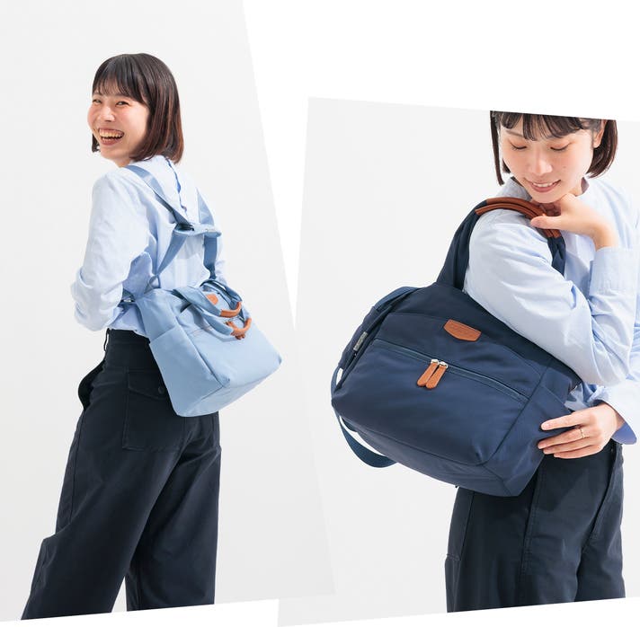 肩にかけられる手持ちも便利です。全体的に体に馴染みやすい素材を採用しているので、背の低い方が持っても大きく見えないちょうど良いサイズ感です。