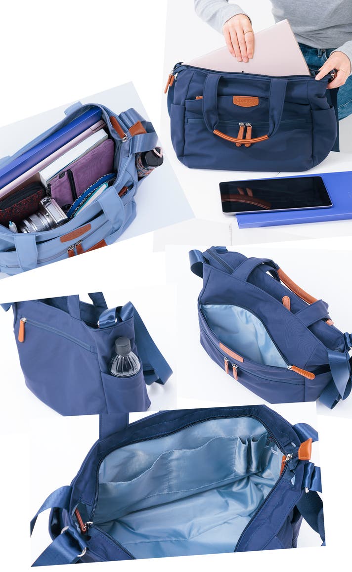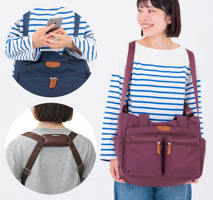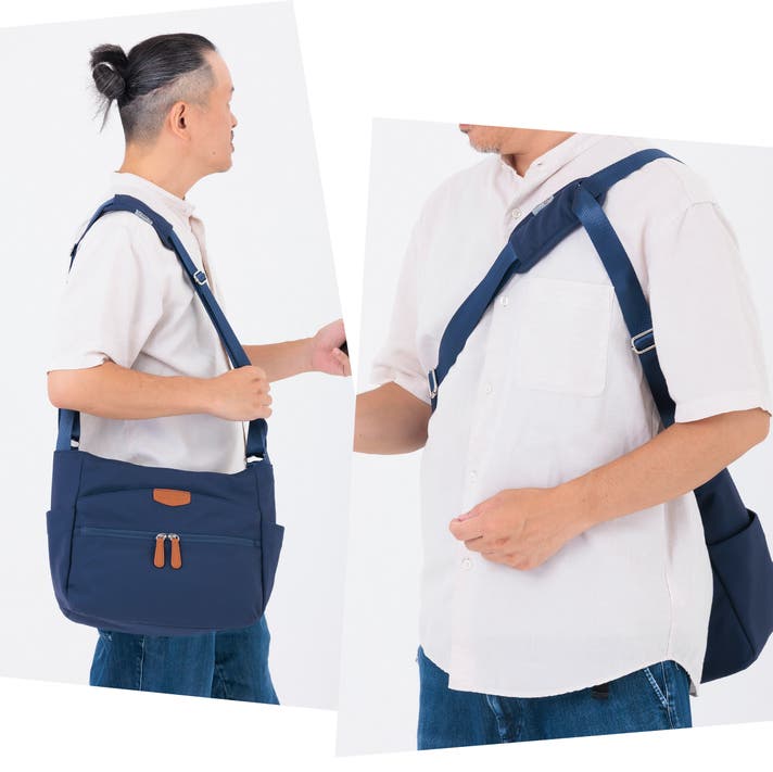 ○ 私は荷物が多くなりがちなので、外側のポケットが多いのが助かります。特に前面の二つのオープンポケットが、サッと取り出したいものを入れるのに便利で良いです。サイドポケットに500mlのペットボトルも入るし、内部のポケットにペンを入れる部分があるのも地味に嬉しいです。色んな掛け方が出来るのも、旅行の時には本当に助かります。特に前抱えは人の多い市場や公共交通機関で安心ですし、荷物が増えて重くなった時にも両肩に重量を分散させられるので楽です。