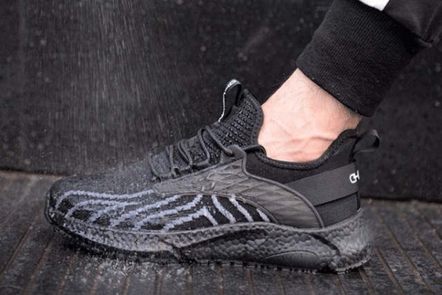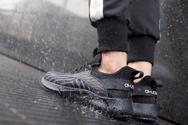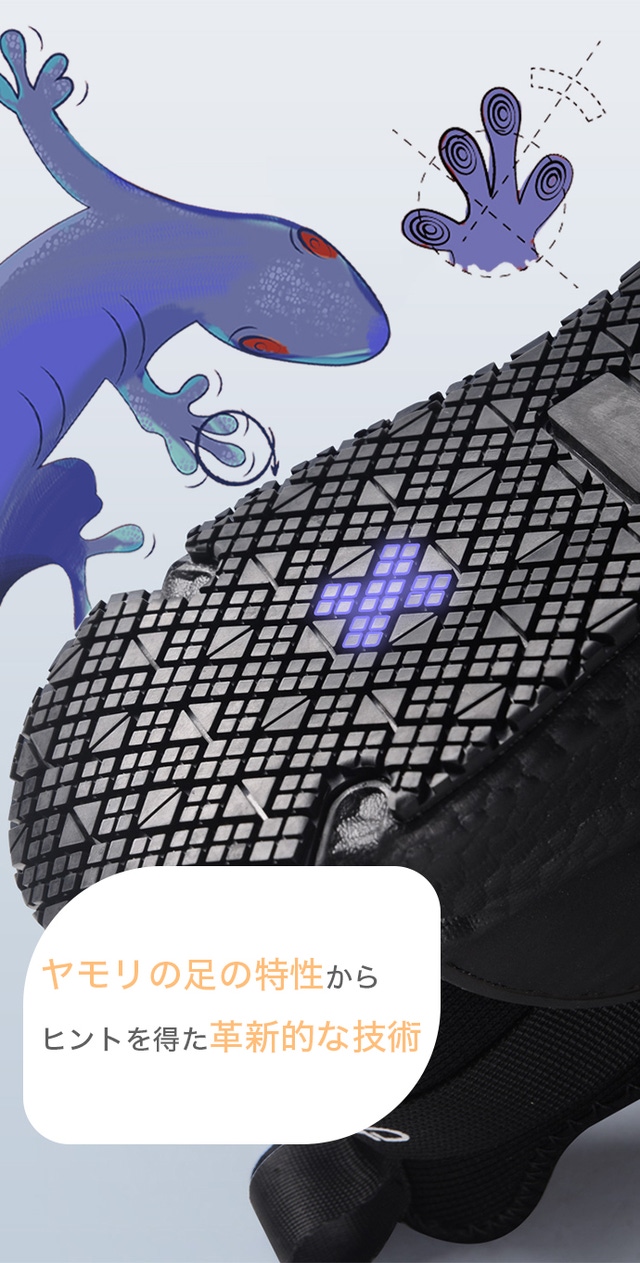 厨盾(キッチンシールド)チームはヤモリの足の特性に注目し、シューズのアウトソールにも、このような特殊なパターンや溝を配置することで、地面との摩擦を増やし、驚きの耐滑性を実現しました。