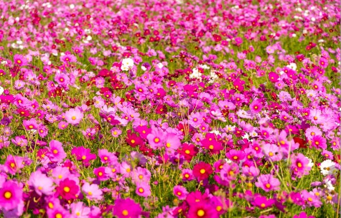コスモスの可憐な薄いカラーから濃いピンクまでいろいろな花があります