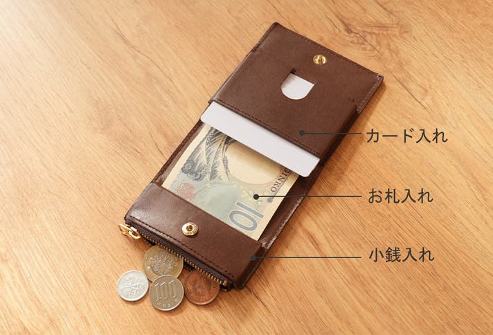 手のひらやポケットにすっきり収まる絶妙な薄さでありながら、必要なカード・紙幣・小銭をしっかり収納可能。