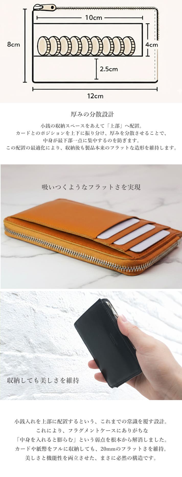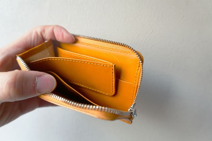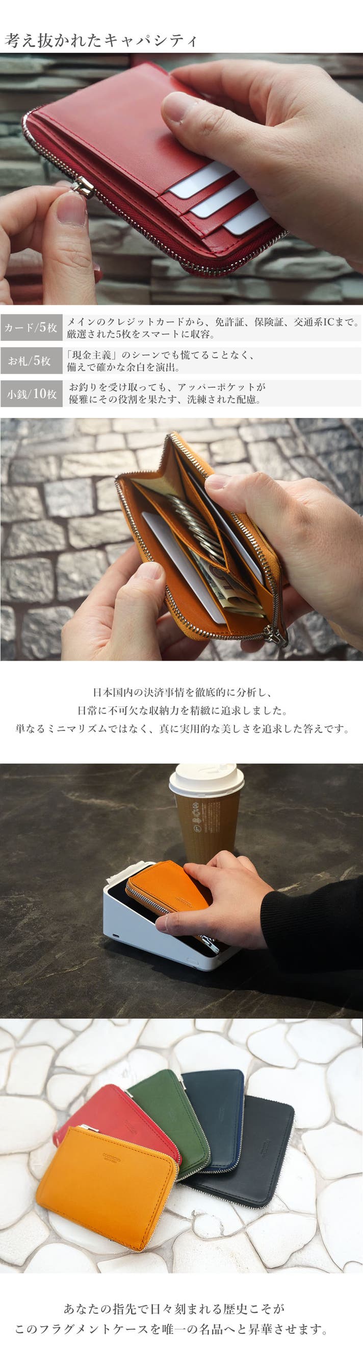 - カード5枚・紙幣5枚・小銭10枚。このコンパクトさで、緊急時も困らない驚きの収納力