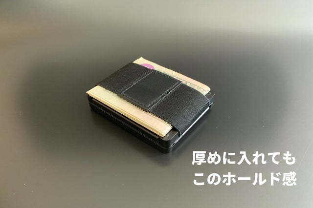 紙幣を多く持ち歩きたいときも、この分厚さでしっかりホールドするので、落ちる心配はありません(もちろん1〜2枚程度の薄さでも落ちません!)。