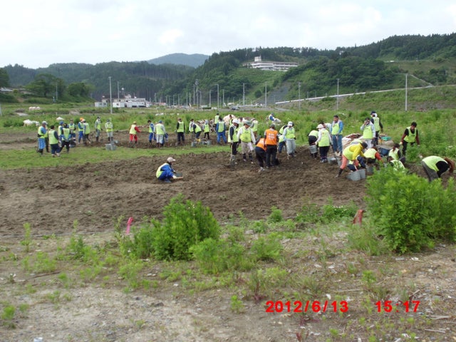 何度か、復興市で南三陸を訪れ、茫漠と広がる殺伐とした被災風景を見るうちに、こんな中に「突如,緑の森が現れたらどうだろう・・・少しは、何かが変わるかも?」と言う思いがわき起こりました。そこで、半ばダメもとで、たけやの阿部さんに使える土地はないですかと尋ねたところ、「いぃだっぺ」と、なんと農地を借りられることになりました。