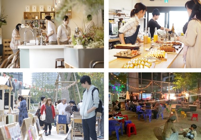 大崎に新しく開発された街区で公民館+カフェのような役割を持つ「café and hall ours」(写真左下)