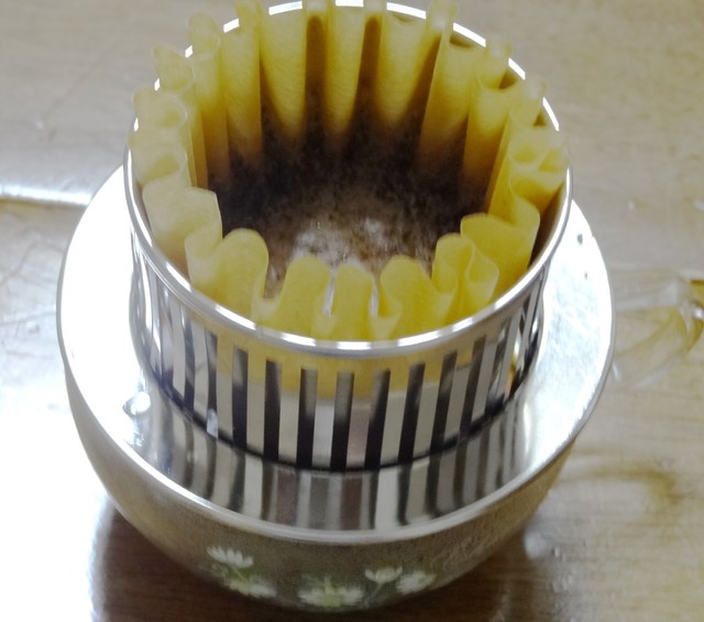 コーヒーの粉を入れる前に市販の丸型ろ紙を敷いておくと、抽出したコーヒーに微粉が入ってしまうのを防ぐことができ、味も若干マイルドになります。