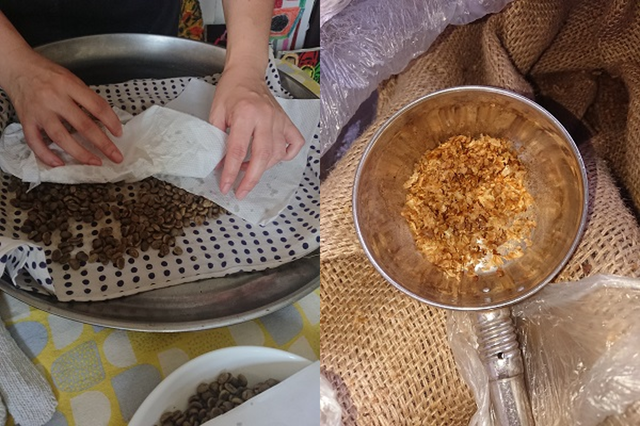 今回使用するコーヒー豆の破砕片とチャフ(シルバースキン)は、同じく大阪の藤田珈琲株式会社様からご提供いただいています。