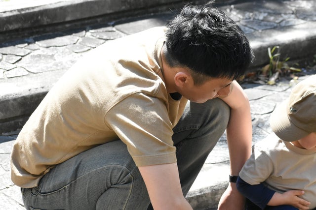 ▲たかよさんに着用いただいたのはYシャツ(レーヨン76%、ポリエステル24%)と、ジーンズ(コットン100%)。ポリエステルなどが入った分だけ珈琲の色は薄くなり、ジーンズも元の色が濃いほど珈琲の色はあまり目立ちません。