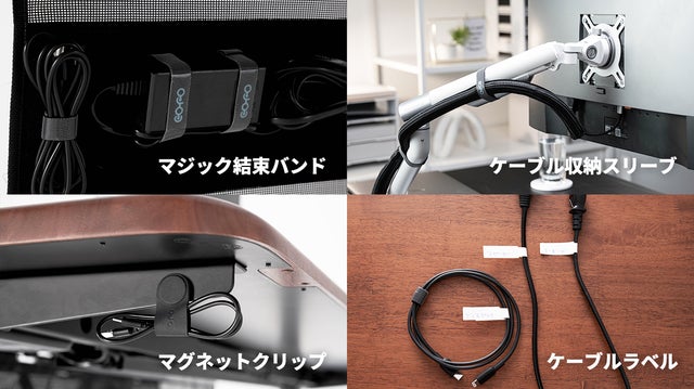 収納に役立つ「マジック結束バンド」「マグネットクリップ」「ケーブル収納スリーブ」「ケーブルラベル」「マグネットプレート」が最初から付属しています。デスクが届いたその日から整理整頓された作業スペースをお楽しみ頂けます。