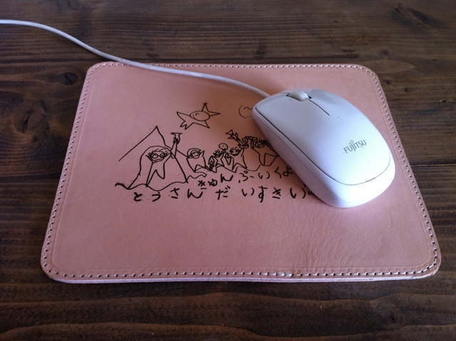 そして、この革小物を作って一番うれしいのは、子供が本当に喜ぶことです。自分の作ったモノが革小物になるって、子供にとってもうれしいことだと思います。子供と一緒に絵を描いたり、文字を書いたりし、新しい思い出を作りながら、残していく。こんな子供と一緒に何かをする時間が、子供の記憶に鮮明に残っていくことでしょう。