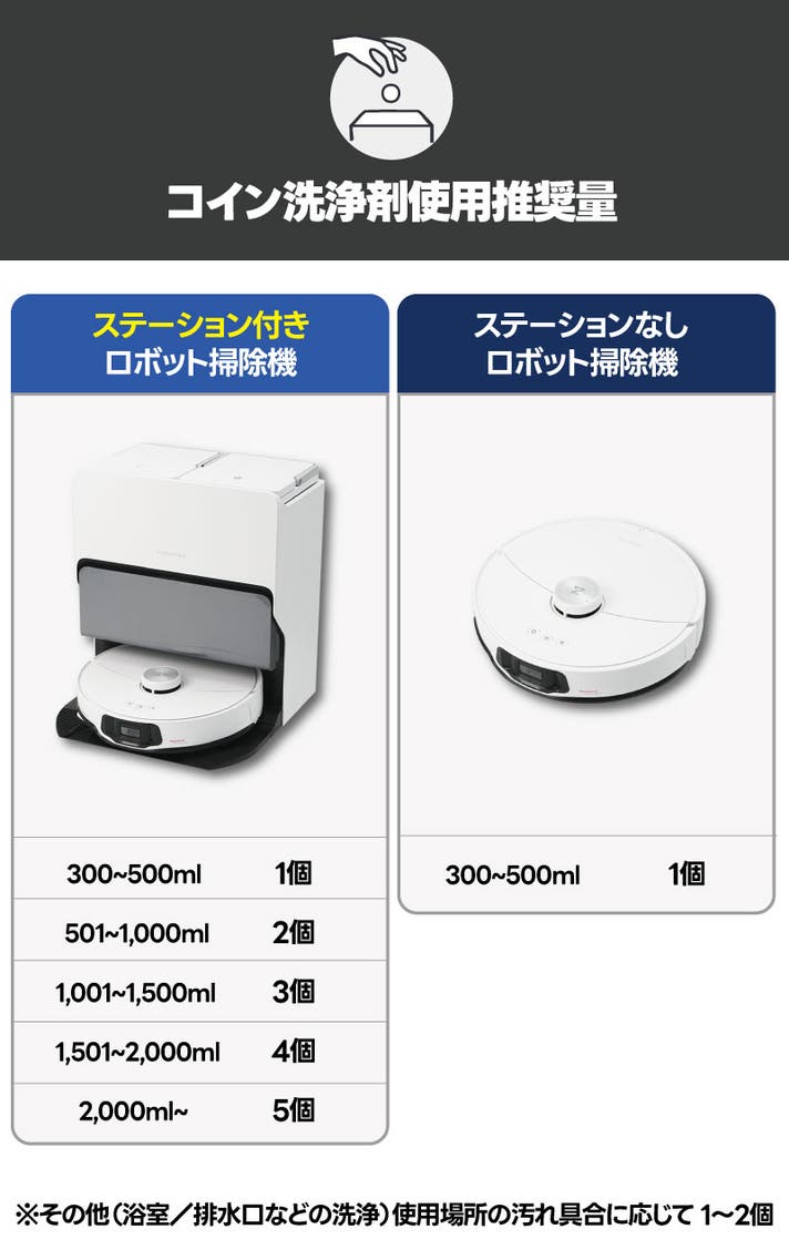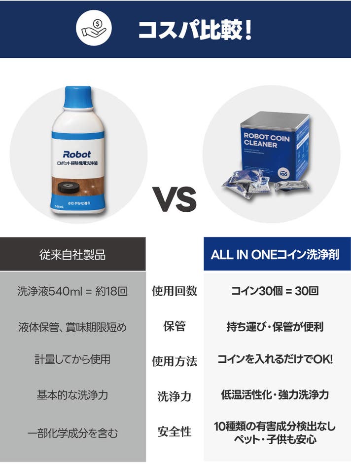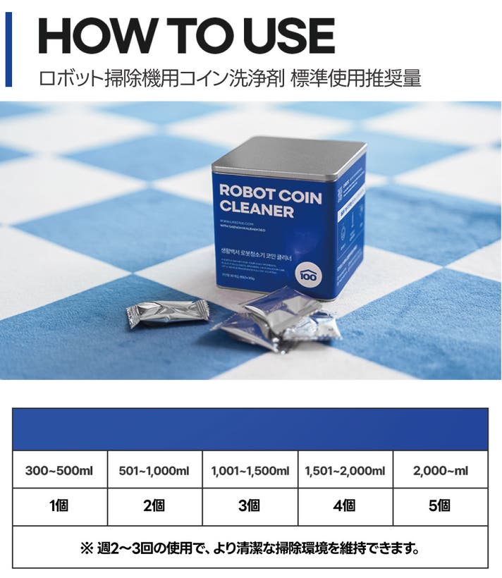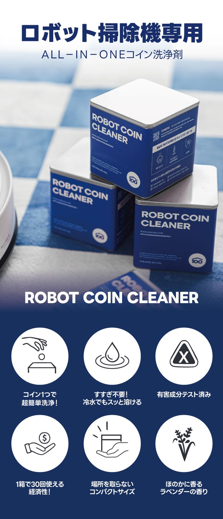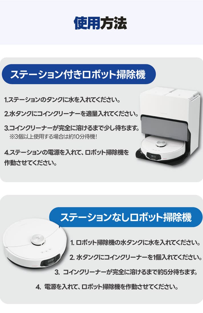 水タンクに入れるだけで、内部の汚れやニオイをすっきり落とせる ロボット掃除機専用コインクリーナー です。