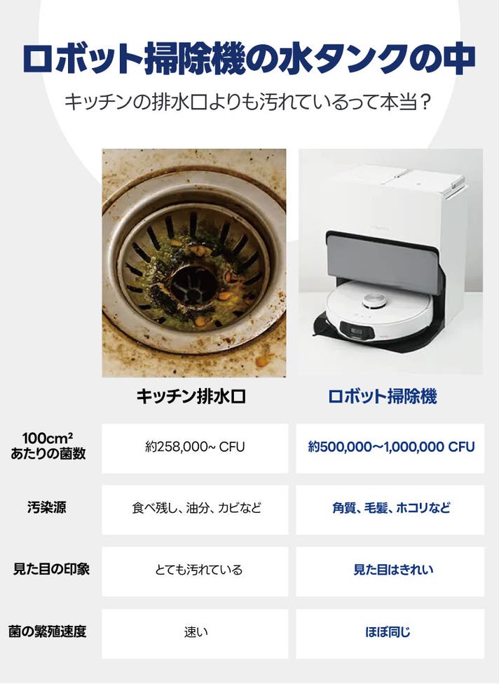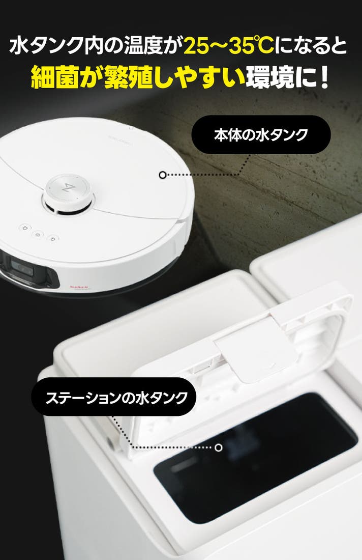 ロボット掃除機の水タンクの平均温度は、細菌やカビが最も好む25~35℃! ホコリや皮脂、食べカスなどがタンク内に残り、菌の繁殖の原因になることもあります。