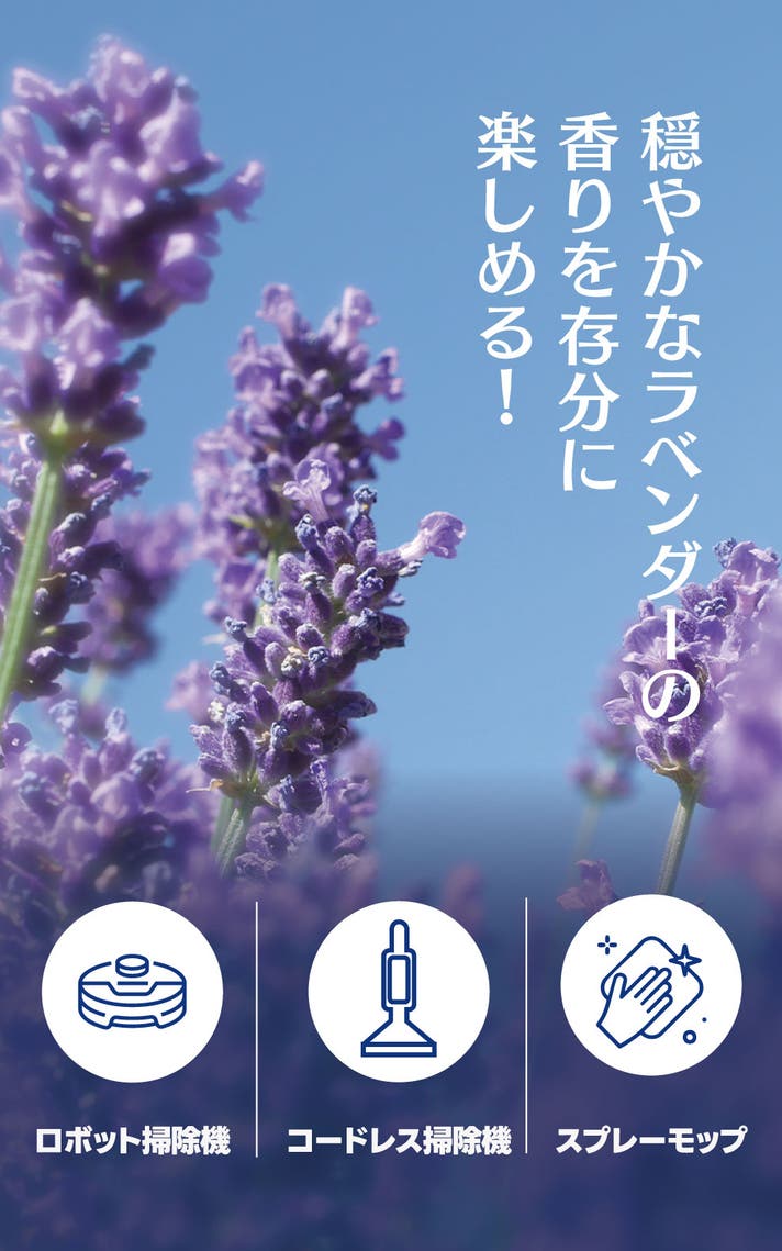 ロボット掃除機、コードレス掃除機、スプレーモップ、手拭きモップにも使えます。タンク洗浄はもちろん、ほのかに広がるラベンダーの香りで癒しの時間を。