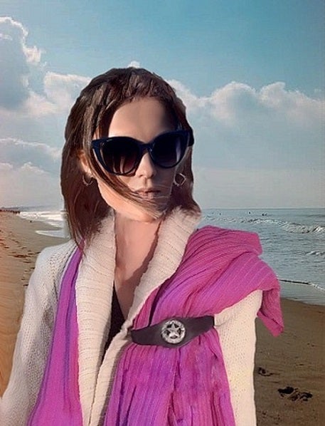 こちらもカーディガンの前身頃に装着後、マフラーを上下から通したリゾート感香るコーデです。こんなふうに自由な発想でお楽しみください。