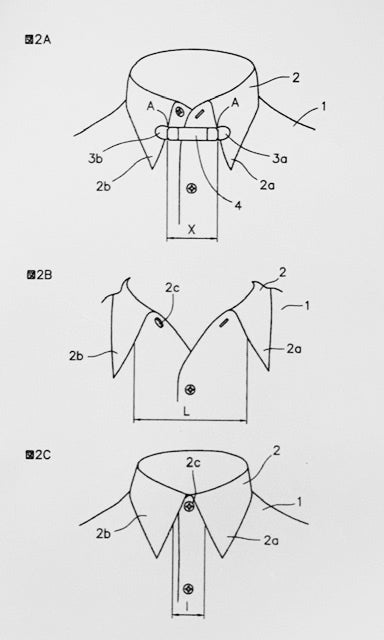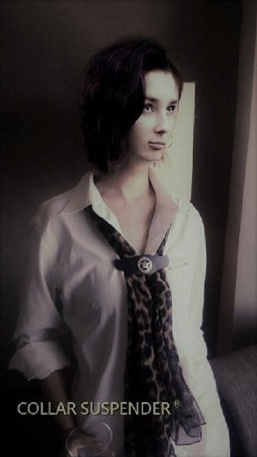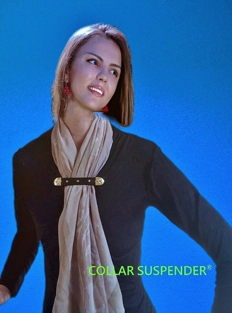 COLLAR SUSPENDERの特筆すべき機能は下図のようにシャツの両側の襟を開きすぎず閉じすぎずの中間で保持することです。すなわち、COLLAR SUSPENDERは襟元の乱れを整えられるオシャレアイテムであり、クールビズ的なニーズにも解を与える、いわば「機能性アクセサリー」として誕生しました。また、後ほどご紹介しますが、更なる応用的な機能としてストールなどの巻き物やカーディガンなどの羽織物を留めたり、押さえてまとめる機能性も持っているため、カラーサスペンダーは男性にも女性にも便利にお使い頂ける商品となっています。
