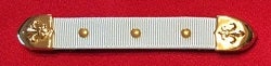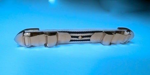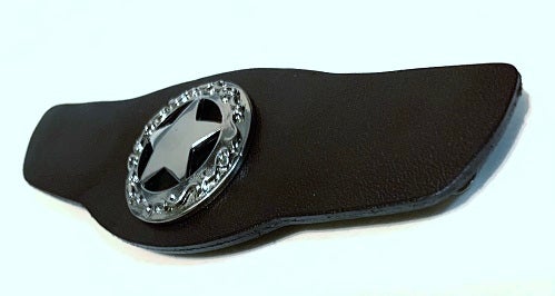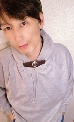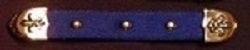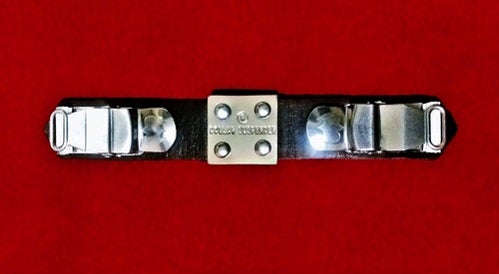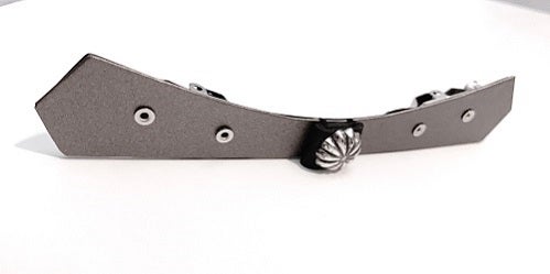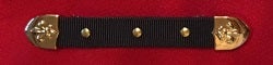 アンフィスにはスタッズが2個で短めのタイプもあります。両端の飾り金具はビーム(光線)のレリーフです。えりの幅を狭く整えたい方にオススメ。本体の下に太めの巻き物を通すのは難しいですが、巻き物の留め飾りとしては優れています。