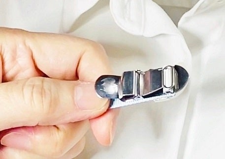 本プロジェクトではCSクリップ(意匠登録済)を独自開発しました。親指一本で軽快に開閉ができます。両襟の幅にアジャストできるように開閉アームを長めに設計してあり、深めに挟むか浅めに挟むかで調整することができます。ただ、Yシャツなどの襟には様々なタイプがあり、場合により襟の先端または襟の根元(上部)の方に装着することでご調整いただく必要がございますことをご了承ください。