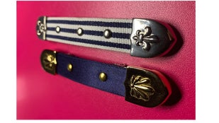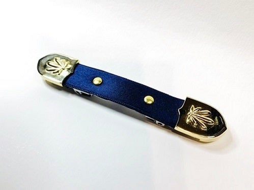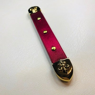 アンフィスにはスタッズが2個で少し短めのタイプもあります。両端の飾り金具のレリーフもビーム(光線)になっていて異なった趣きに仕上げてあります。スタッズが2個のタイプのアンフィスも両端の飾り金具(ビームのレリーフ)が金色のものと銀色のものをご用意いたしました。今回本体の布のお色は8種類ご用意しましたので、こちらも8✕2の16種類ございます。生地色の種類等は上記アンフィス スリースタッズ(アイリスエンド)とすべて同じです。