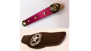 リターンの1つ目は「アンフィス」です。胸元にキラリとお洒落なアクセサリーとして、また差し色としても効果的です。すっきり一列に並んだスタッズにもご注目。えりに直接装着したり、巻き物の留め飾りとして胸元にアンフィスを付けて街を闊歩するだけで、きっとあなたをどこか行ったことのない斬新でスタイリッシュな世界にいざなってくれることでしょう。両端の飾り金具(アイリスのレリーフ)が金色のものと銀色のものをご用意いたしました。生地の色は8種類の中からお選びいただけますので、スタッズが3個のタイプのアンフィスは全部で8✕2の16種類ございます。