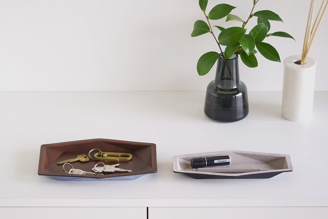 デスクまわりやシェルフ、ベッドサイドなどのインテリアに映える多面体が美しく高級感を感じる本革製のトレイです。またお気に入りの場所に、お気に入りのものを置くことでより愛着がわく存在になります。