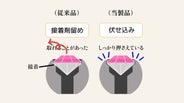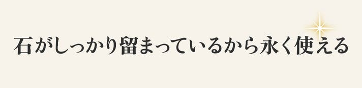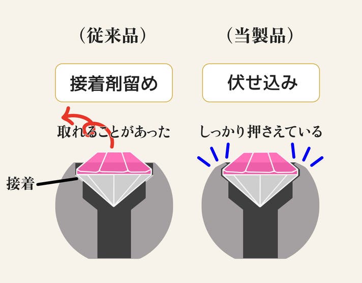 今回の「アタラシイ」プロジェクトでは、工場で石を伏せ込み(ベゼルセッティング)にし、入浴や洗浄、長期のご使用で取れるおそれが極めて低くなりました。