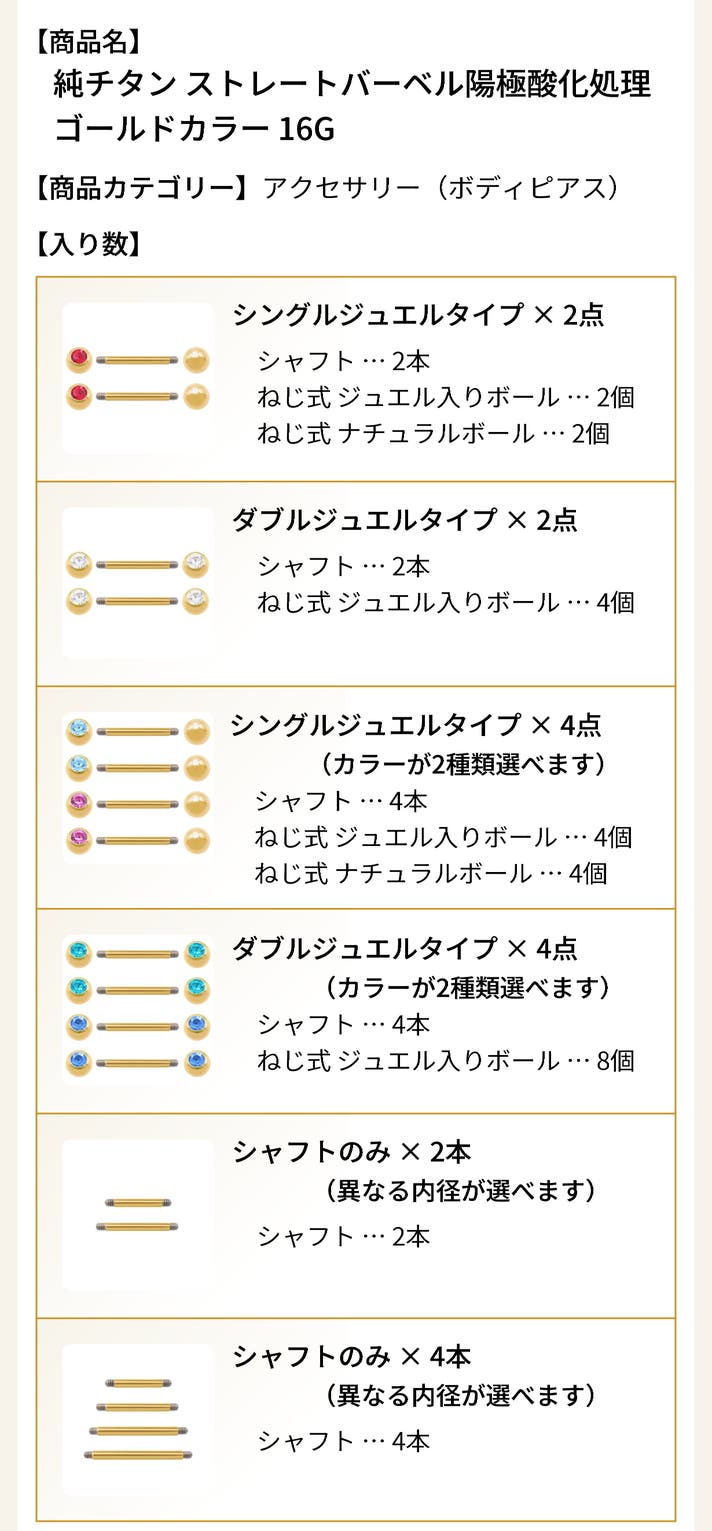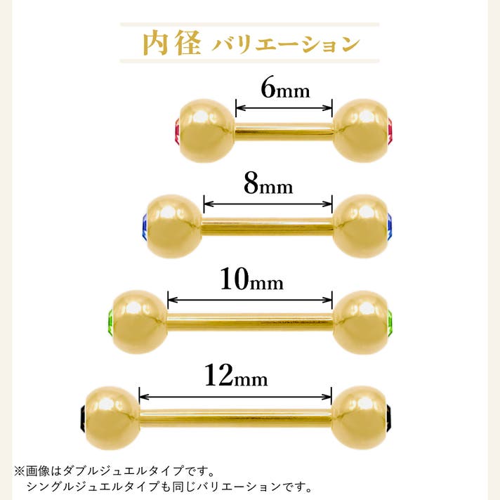 【 純チタン ストレートバーベル 16G 陽極酸化処理(アノダイズド)ゴールドカラー 4mmダブルジュエルボールタイプ×4点(内径は1サイズ、カラーは2種類選べます)】