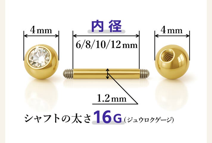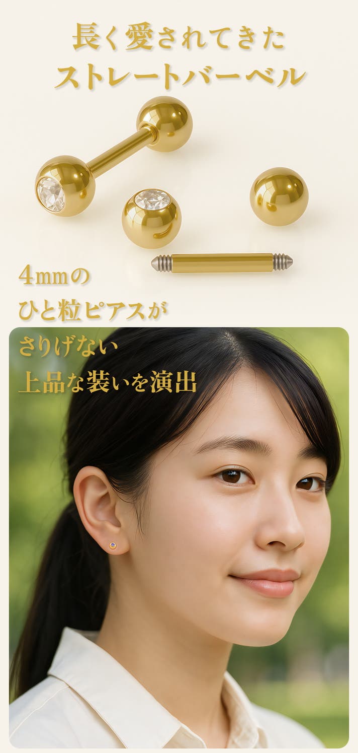 【 純チタン ストレートバーベル 16G 陽極酸化処理(アノダイズド)ゴールドカラー 4mmシングルジュエルボールタイプ×4点(内径は1サイズ、カラーは2種類選べます)】