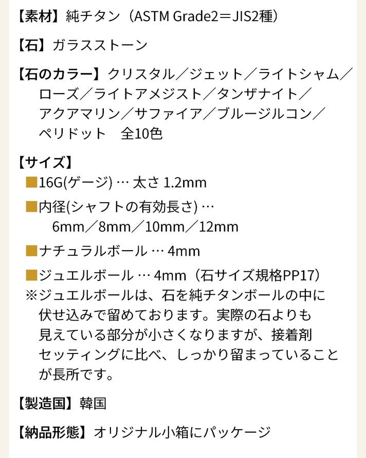 - ピアスの素材と品質にこだわる方へ、敏感肌にもお勧めな陽極酸化処理の純チタンボディピアスです。