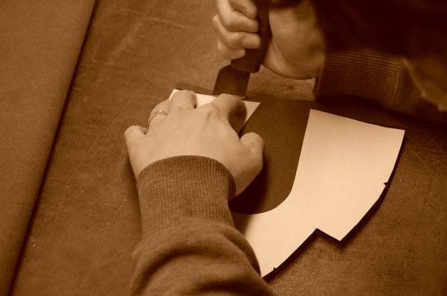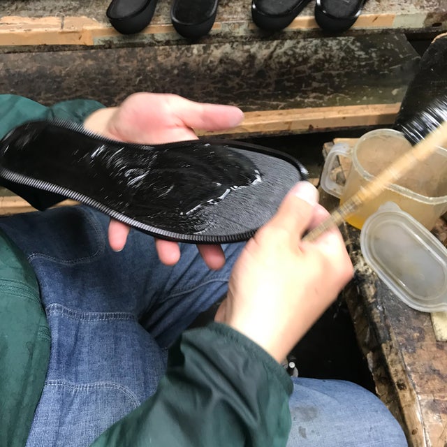 靴型に中底と呼ばれる底を打ち付け、それに裁断、縫製した靴の原形の革を巻き、糊で張り付けていきます。