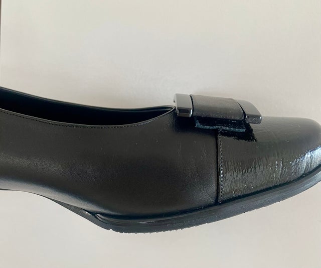 切り替え部分のデザインのの素材の違いにより、お洒落に見せながら、固いエナメル革で足先と踵を守り、柔らかい素材の革で外反母趾の部分の当たりを軽減。