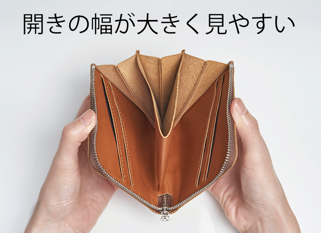 通常カード入れ部分は革が重なるため厚みが出てしまいますが、このお財布は一枚のパーツに切り込みを入れ厚みが出ないよう仕上げています。