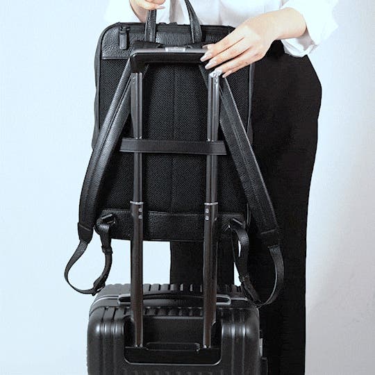 出張や荷物が多い際に、キャリーケースをお使いになることも想定。その際にも便利なよう、背面にはキャリーケースに固定できるベルトを付けています。