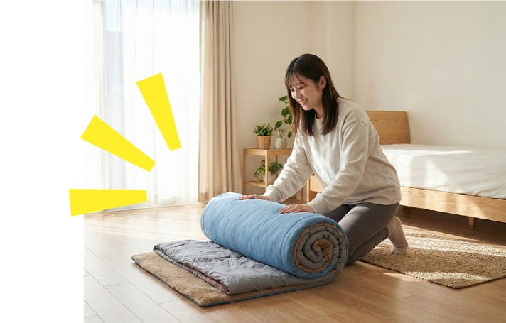 - 約80×180cmのベースサイズで巻いてコンパクト。広げてたっぷり使えるマットレスセット。
