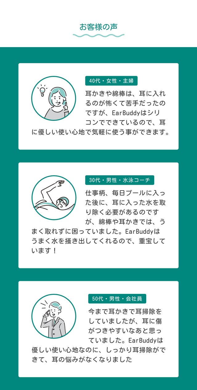 EarBuddyは耳垢を奥に押し込んでしまったり、耳の中を傷つけてしまうことで、耳に負担がかかったり、衛生環境を悪化させる事が起こりにくいよう、作られています。