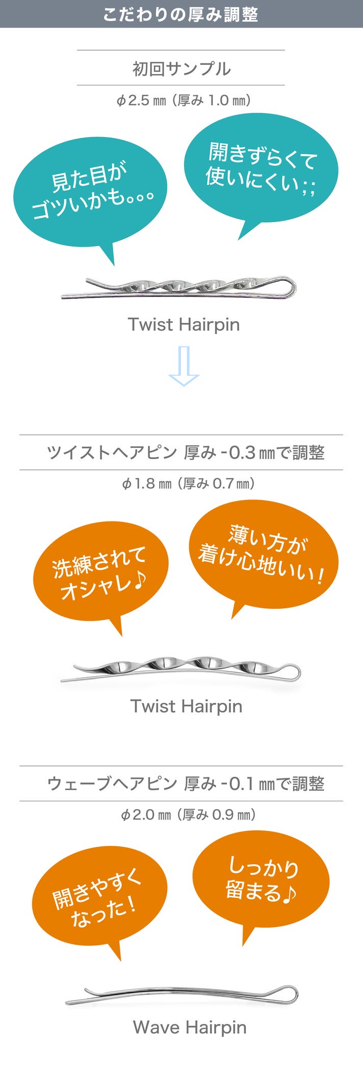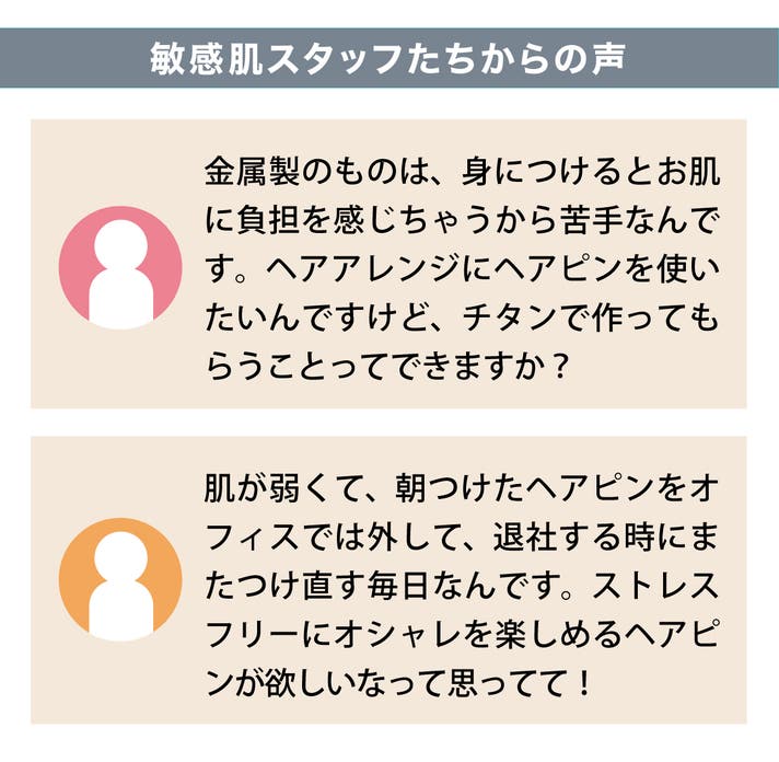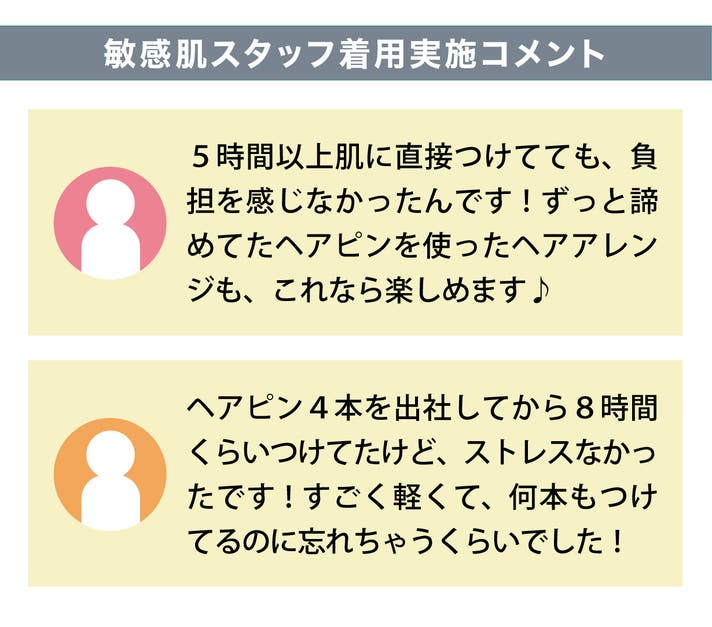 ヘアピンはこれまでに開発したスティック、コーム、ヘアバンドに比べて地肌に触れる面積の多いヘアアクセサリーです。そしてほとんどの製品が金属で作られているため、敏感肌の方は長時間の着用に抵抗があるのではないでしょうか。