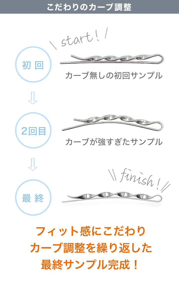 その経験があったからこそ私たちは、シンプルな構造と形状のヘアピンなら、正直、数回の試作で仕上がる——そんなふうに、難しくないだろうと考えていました。