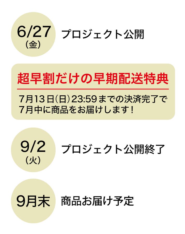 このプロジェクトはAll in型です。目標金額の達成に関わらず、プロジェクト終了日の2025年09月02日までに支払いを完了した時点で購入が成立します。