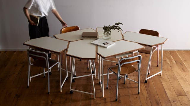 六角形の天板によって組み合わせの幅が広がり、ワークショップやセミナー、ICT を活用したアクティブラーニング等、目的に合わせた最適なレイアウトでコミュニケーションを活発にします。組み合わせは無限大。人数に合わせて多様な組み合わせが可能です。
