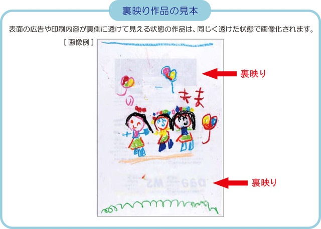 広告の裏やカレンダーの裏などに描いた絵は、表側の印刷内容がうっすらと透けて見えることが多々ありますが、撮影時も透けた状態で画像化されます。