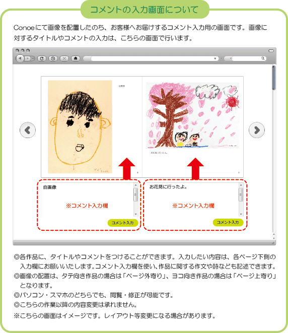 絵のタイトルやコメントを入力したり、作品数が足りなかったお客様はここで画像を挿入することができます。